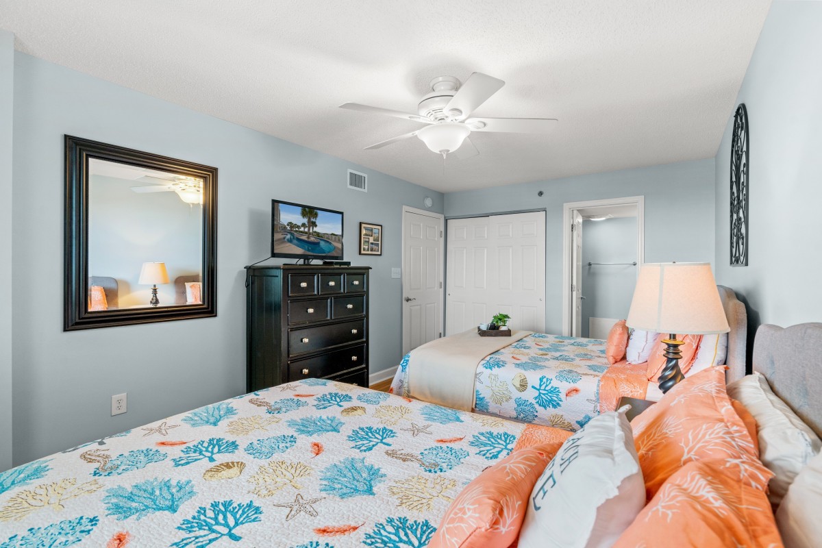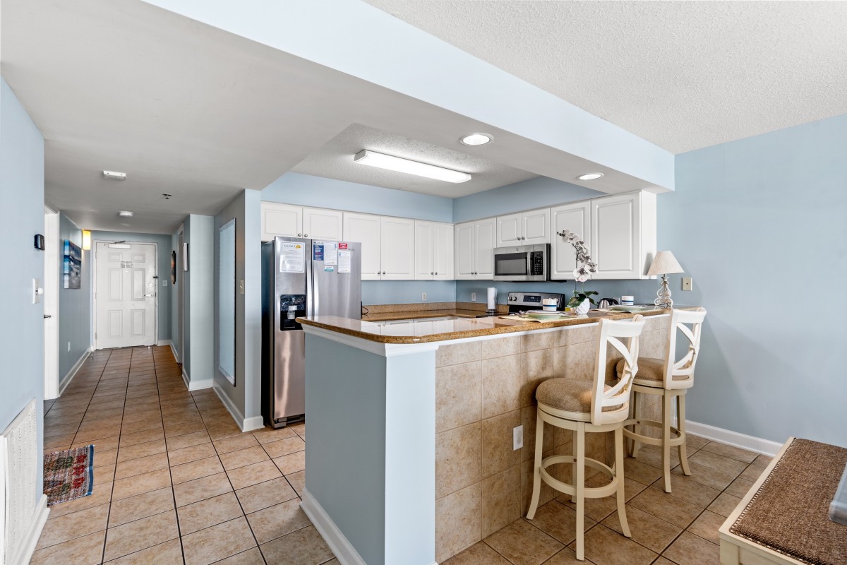 Treat your family to appetizers and icy cold beverages that you serve on the oceanfront balcony of Bluewater Keyes 1005. Both are easily prepared in the fully-furnished kitchen that features a microwave, dishwasher, oven and full-size refrigerator. Ride the elevator to the sundeck level and immerse yourself in recreational options that are sure to leave you feeling rejuvenated. The oceanfront playground consists of a hot tub, swimming pools, covered swimming pool and a lazy river. Plus Bluewater Keyes Resort offers a kiddie pool for the smallest children in your family. Poolside lounge chairs beckon you to put your feet up and read a book or take a nap. The oceanfront sundeck is a hive of activity and a beautiful transition to the beach, on which you can spend hours working on your tan and playing in the water. After a day of sightseeing, fishing, playing, shopping, golfing and dining, retreat to Bluewater Keyes 1005 for peaceful slumber. Reserve your family beach vacation now.