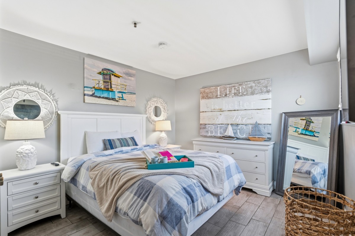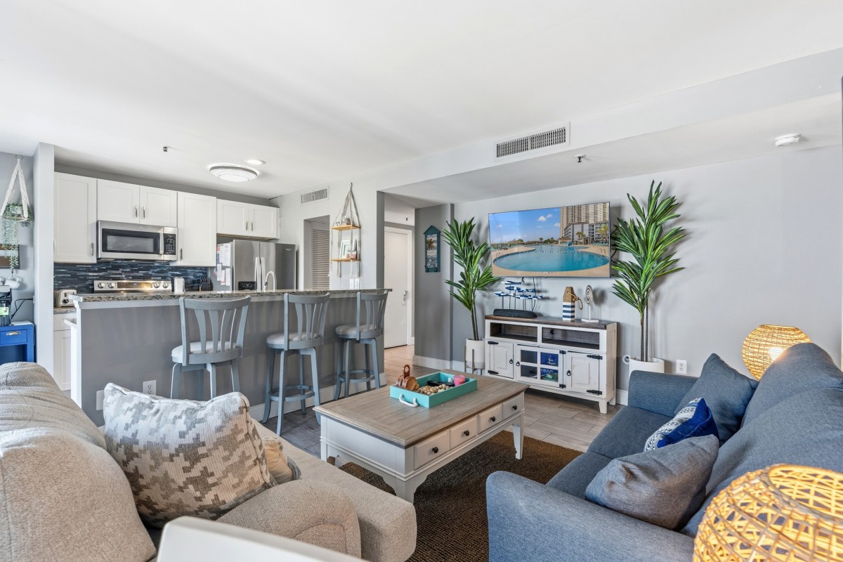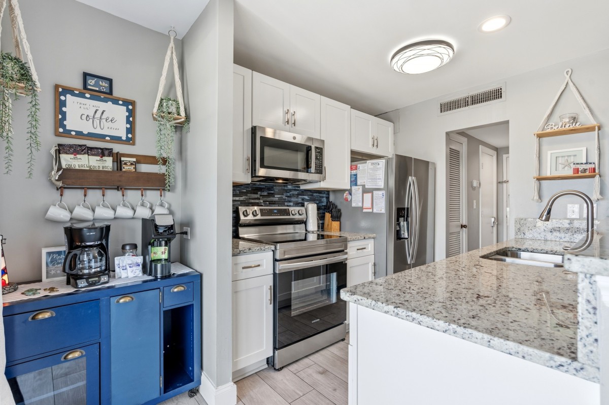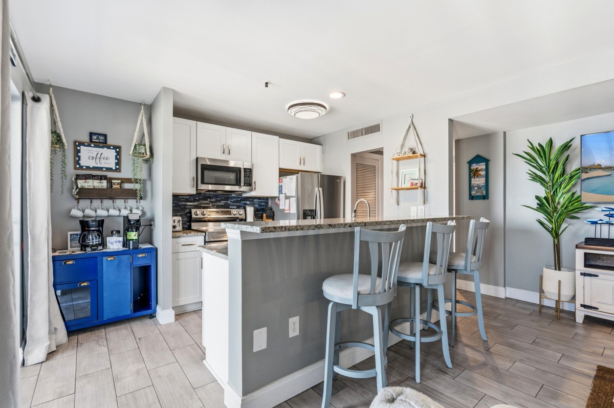 The central location is perfect, being that it's 13 minutes from downtown Myrtle Beach, 6 minutes from Surfside, and 15 minutes from Murrells Inlet. Even better is the fact that there's a Walmart grocery store across the street from the resort! The entire condo has been updated, including all new shaker white cabinets in the kitchen, stainless steel appliances, granite countertops, and even a breakfast bar! The master bathroom has a brand new tiled floor-to-ceiling walk-in shower. All furniture and decor are brand new for 2022, including all TVs, which are smart TVs so that you can watch all your favorite TV shows while relaxing in the condo. The bedrooms include brand new tempurpedic mattresses and pillows in both the master and guest bedrooms.