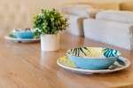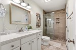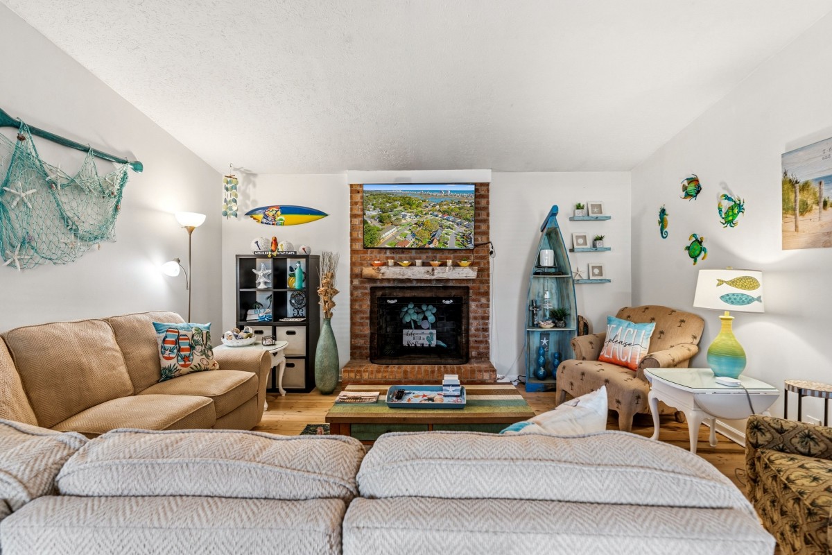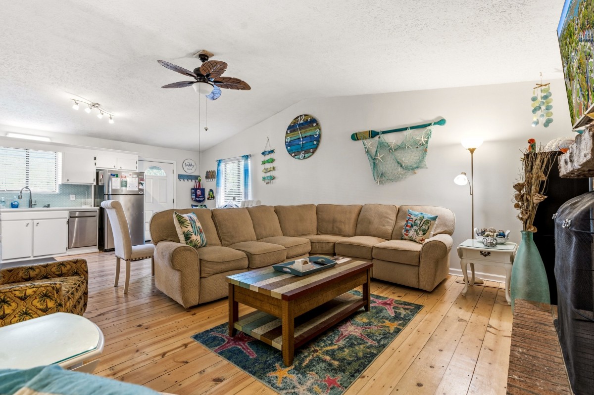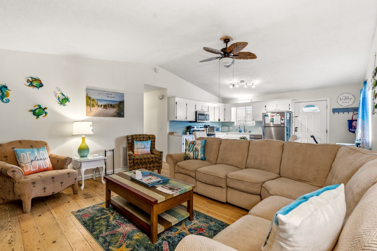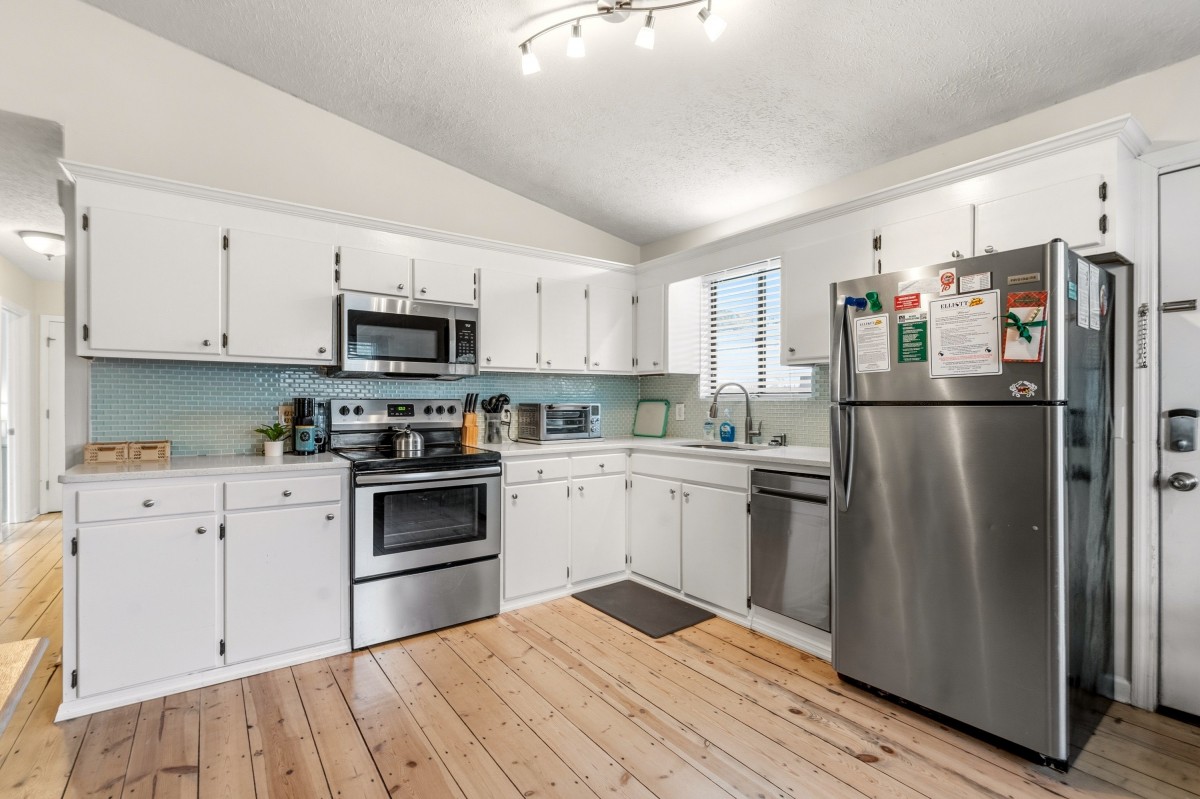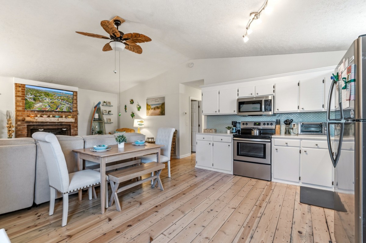 The kitchen is equipped with full-size appliances and plenty of counter space and storage to prep and store items. The rental is conveniently located three blocks away from the beach for frequent trips to the shore.