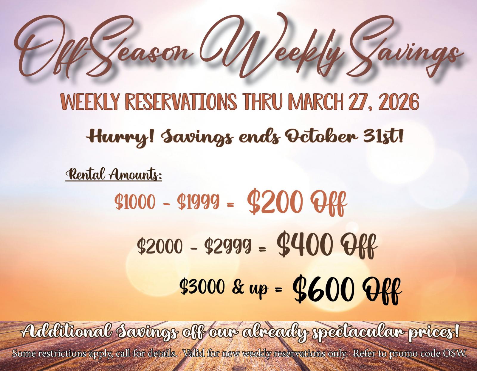 *Please note: Some restrictions apply, call for details. Not all properties participate in discount programs. Not valid on confirmed reservations or golf packages. Can not be combined with any other discount offers