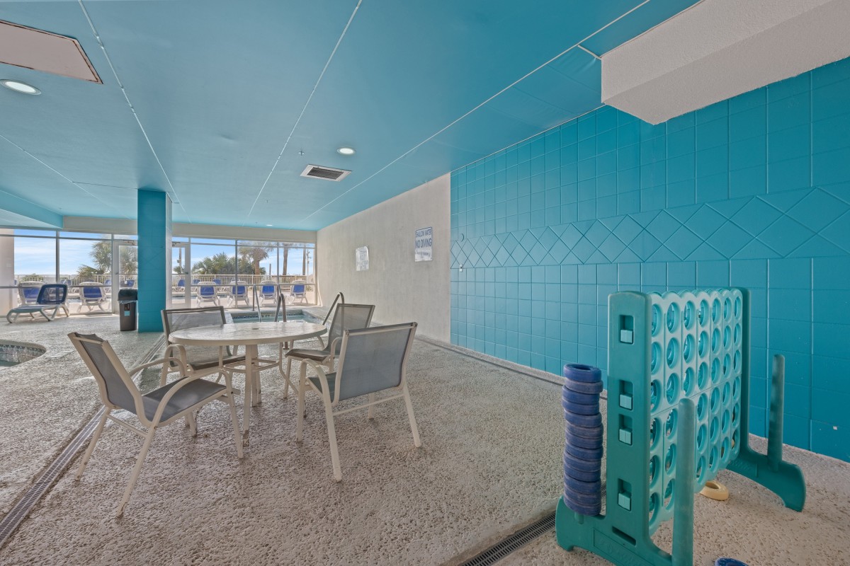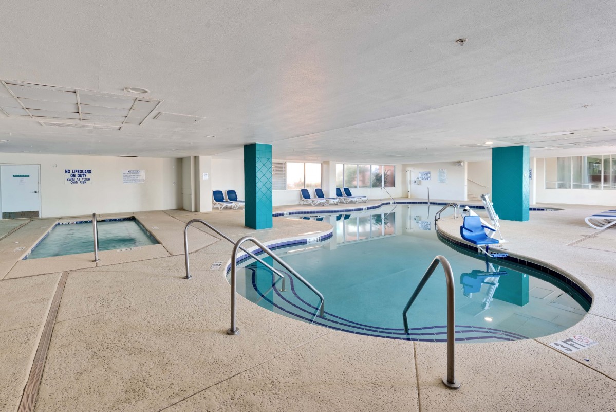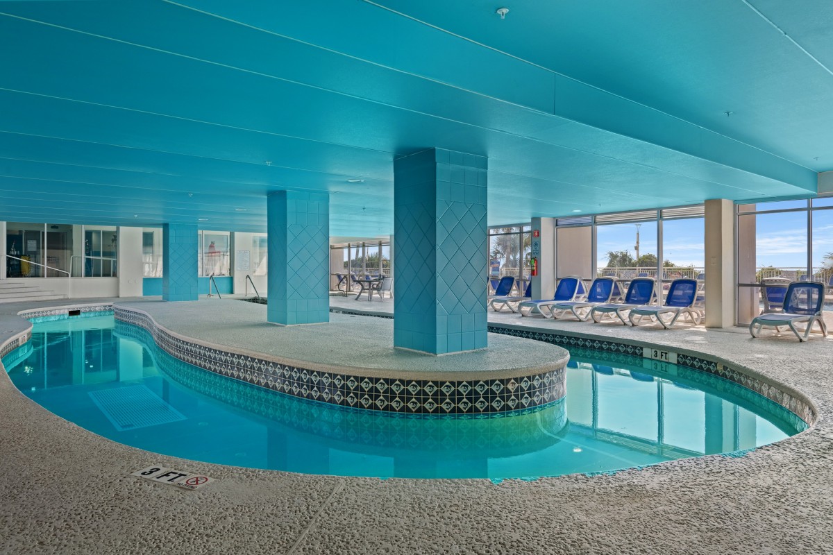 The oceanfront pool deck at Bay Watch Resort I features a sparkling blue swimming pool and a couple hot tubs. You can easily race to the edge of the Atlantic Ocean from your poolside lounge chair from this North Myrtle Beach resort. From the balcony of your oceanfront or ocean view North Myrtle Beach rental at Bay Watch Resort I you can see the Atlantic and hear the crashing waves. This resort has a lazy river, indoor swimming pools, kiddie pool, fitness center, restaurant, sports bar, convenience store and covered parking. This oceanfront resort is also smoke-free.